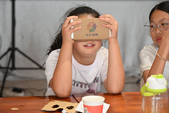 | 圖為孩子體驗制作好的VR眼鏡 | 圖為孩子沉浸式體驗3D世界 |