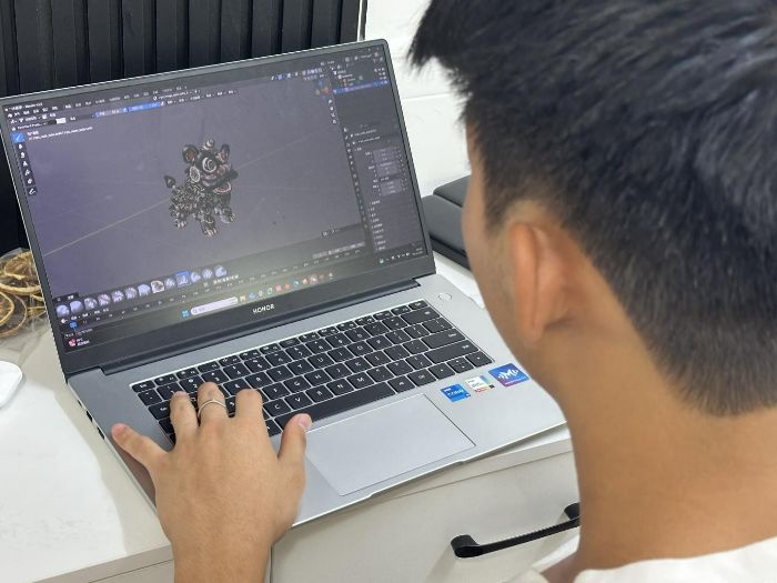 圖5: 技術組成員在工作室利用3D建模軟件精細調整醒獅模型。(陳純敏 攝)
