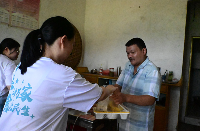第三站,在走訪期間,服務(wù)隊(duì)了解到郭河鎮(zhèn)河口村存在七位行動(dòng)不便的空巢老人。中午時(shí)分,志愿者們帶著滿滿的愛心與關(guān)懷,按照老年人的健康需求精心搭配了營養(yǎng)餐,并且一家一戶地送到他們手上。在送餐的時(shí)候,通過耐心溝通,我們直接知曉了老人的生活狀況和健康情形,這樣就能在后續(xù)為他們提供更優(yōu)質(zhì)的服務(wù)與支持。期間,有位老奶奶感動(dòng)表示:“謝謝你們還掛念著我們這些空巢老人,你們的到來讓我們感受到了溫暖,仿佛家人就在身邊一樣。”