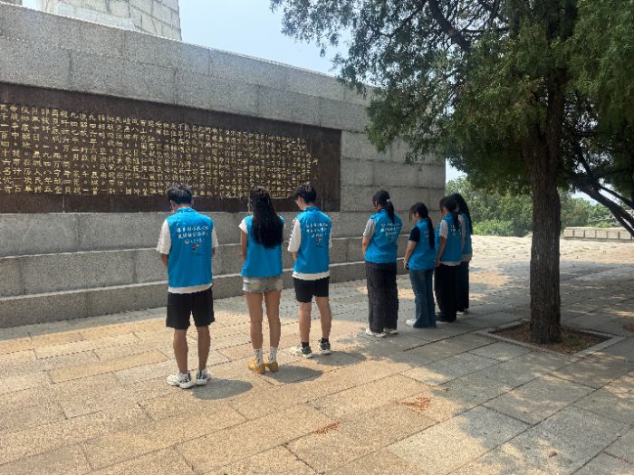 在紀念碑前,實踐團成員列隊肅立,舉行緬懷儀式。全體成員向革命先烈敬獻花籃、整理緞帶,隨后集體深鞠三躬,表達對英烈的崇高敬意。實踐團成員劉亞楠同學說:“站在紀念碑前,深切體會到今日和平生活的珍貴,那是先烈們以鮮血和生命換來的,他們的犧牲與奉獻將永遠鐫刻在我們心中。”活動尾聲,成員們在陵園門口合影,以鏡頭定格對英烈的緬懷之情。