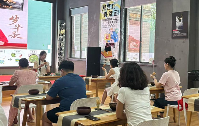 活動聚焦文化根脈與青年使命,致力于將古籍中記載的宋代點茶技藝轉化為可感、可知、可參與的生動實踐。文化講堂環節,主講人系統梳理了茶百戲的千年發展脈絡,從茶圣陸羽的《茶經》記載,到宋代文人“斗茶”風尚的興盛,再到茶百戲“清水丹青”技法的獨樹一幟。青年學員們深入了解了從唐代煎茶到宋代點茶的技藝流變,并深刻認識到茶百戲與茶筅、茶盞等器物所承載的深厚文化關聯,為后續的實踐奠定了堅實的認知基礎。