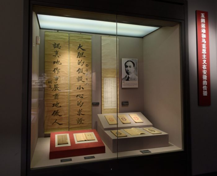 接著往里走,就是第一個(gè)專題——革命賡續(xù) 安徽建黨。鴉片戰(zhàn)爭(zhēng)后,中國(guó)逐步淪為半殖民地半封建社會(huì)。清廷的腐朽統(tǒng)治與西方列強(qiáng)的殖民壓榨,造成安徽人民饑寒交迫,苦不堪言。為實(shí)現(xiàn)民族獨(dú)立與國(guó)家富強(qiáng),安徽人民奮起抗?fàn)帲_反帝反封建斗爭(zhēng)的序幕。五四運(yùn)動(dòng)后,馬克思主義與中國(guó)工人運(yùn)動(dòng)相結(jié)合,誕生了中國(guó)共產(chǎn)黨,中國(guó)革命面貌從此煥然一新。安徽地方黨組織建立后,成為領(lǐng)導(dǎo)安徽人民進(jìn)行新民主主義革命斗爭(zhēng)的核心力量。