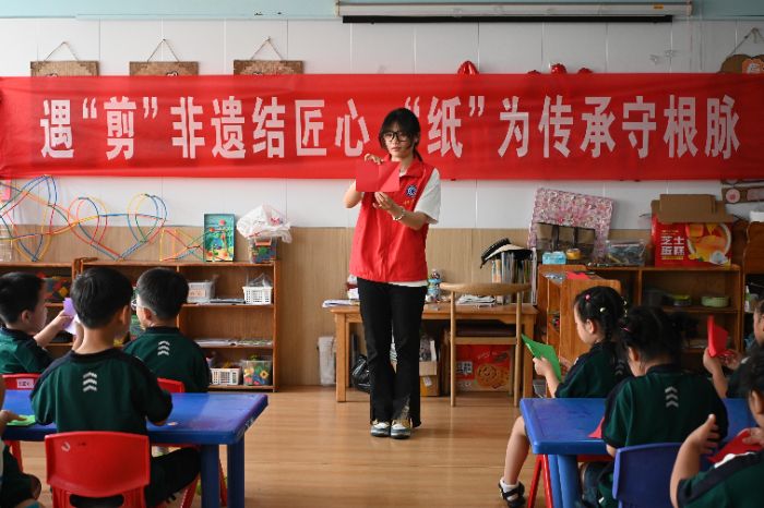 幼兒園里,隊員們帶來了紅紙與安全剪刀,開啟“剪紙里的紅色故事”趣味課堂。隊員們邊教孩子們剪五角星、八角帽,邊講簡單的紅色小故事。老師李娜笑著說:“這樣的課比課本里的故事更讓孩子有感觸。”