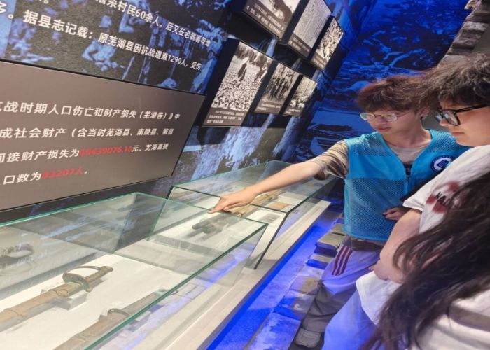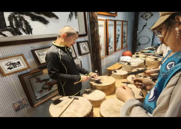 西河古鎮的青石板路上,藏著非遺傳承的溫度。實踐小隊專程拜訪當地鐵畫匠人陶老師,隊員唐靜雯、張洵作為代表,在叮叮當當的鍛打聲中學習鐵畫制作技藝,親手觸摸這項國家級非遺的剛柔并濟。此外,經過簡易培訓,隊員們化身古鎮講解員,在新四軍第三支隊紀念館等歷史點位前,為游客講述西河的抗戰記憶與歲月故事,讓沉睡的歷史在生動敘述中蘇醒。