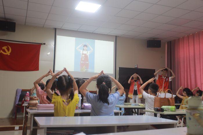 音樂響起時,志愿者帶領孩子們做起手勢舞:幾十雙小手相觸連成“長城”,扎羊角辮的小姑娘踮腳抬臂,辮梢的紅蝴蝶結顫動如旗幟;旋律漸強時,所有手勢先貼胸再用力前推,孩子們混在音樂里含糊卻堅定地唱著愛國主義的主旋律。
