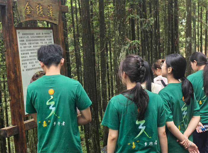 以“林下經濟”為主題。實踐隊在講解員的帶領下,深入后洋村的林下種植基地。茂密的杉樹林中,陽光透過枝葉灑下斑駁光影,瞬間被撲面而來的清新空氣包圍。“這里的負氧離子含量是城市的十數倍以上,堪稱天然氧吧,”講解員指著參天杉樹介紹道。在杉木蔭蔽下,一片片金線蓮正茁壯生長。“金線蓮具有一定的藥用價值,如清熱涼血、除濕解毒的功能。”講解員解釋道。這種林藥共生模式,既保護了生態,又創造了經濟效益。