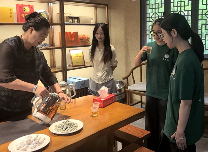 隨后,實踐隊來到黃振芳家庭農場。與農場主交流碳匯造林、生態保護與經濟收益協同經驗。農場主黃振芳的兒媳婦為實踐隊展示“碳匯造林”成果,農場通過“以短養長”模式,在速生林中套種經濟作物,既保護了生態,又實現了增收。