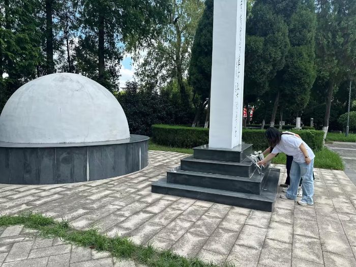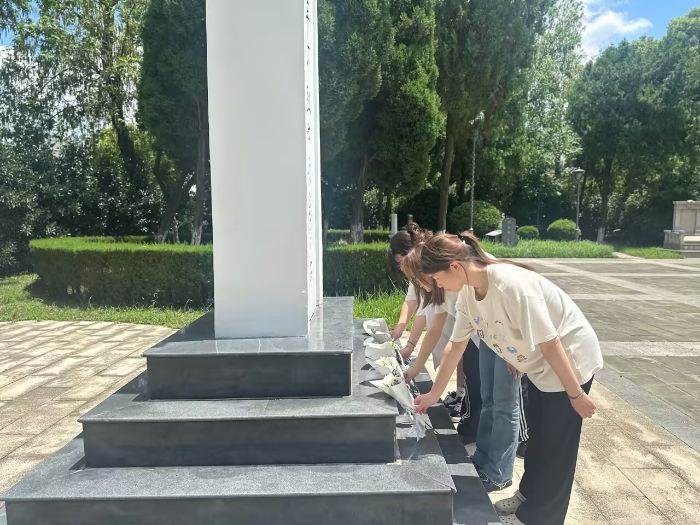 隨后,團隊在黃橋公園烈士紀念碑前舉行莊重的祭掃儀式,全體成員列隊肅立,向革命烈士鞠躬致敬,默哀三分鐘以寄哀思。團隊代表手捧精心準備的白菊,緩步走向紀念碑,將鮮花整齊擺放在碑座四周,朵朵白花寄托著對先烈的深切緬懷。部分成員拿出紙筆,認真抄錄紀念碑上的烈士名錄,一字一句間飽含著對英烈的崇敬之情,還有同學輕輕擦拭碑身浮塵,用實際行動表達緬懷之意。