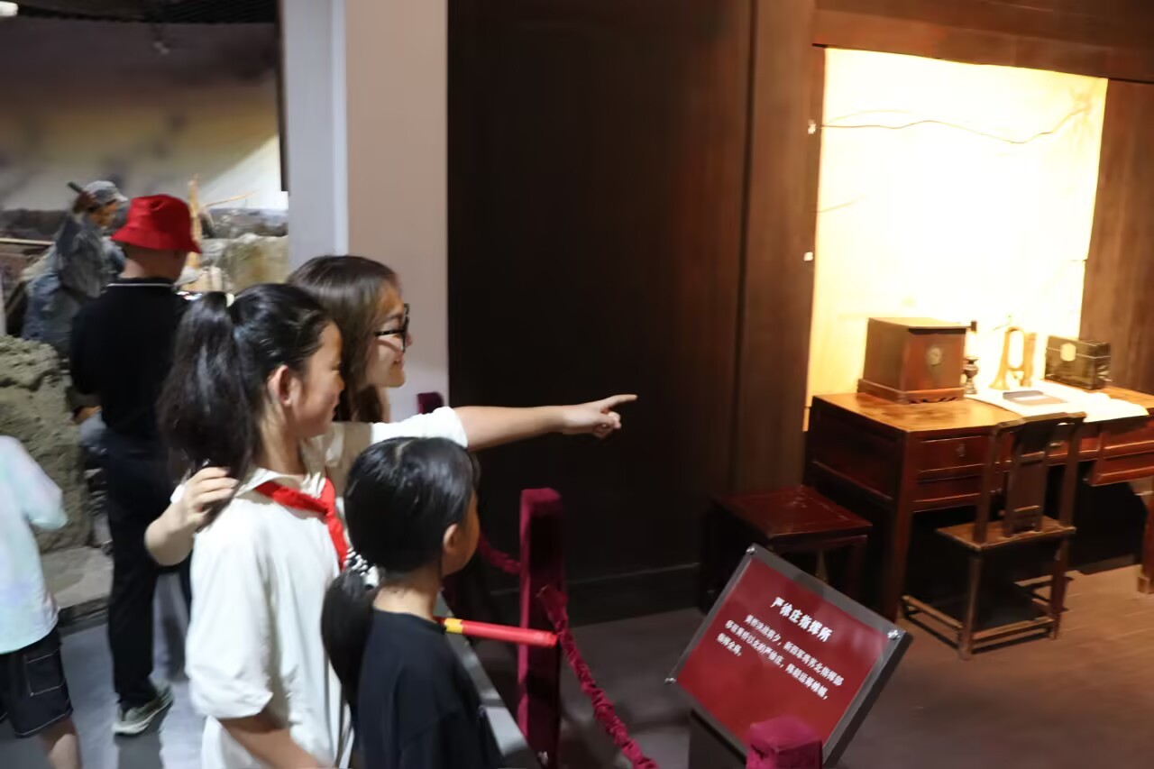 讓紅色歷史變得可知可感,助力紅色基因融入童心。8月3日至4日,“烽火黃橋,赤心傳薪”三下鄉實踐團隊宣傳組特別策劃紅色研學活動,帶領當地 20 余名小學生走進新四軍黃橋戰役紀念館。志愿者們提前備好講解素材,化身 “紅領巾講解員”,著重為孩子們講述銹跡步槍、補丁軍裝等文物背后的戰斗故事,用生動語言還原百姓支前場景。孩子們瞪大雙眼認真聆聽,指著泛黃的作戰地圖追問細節,不時舉手提問 “戰士們吃什么”“燒餅怎么送到前線”,互動熱烈。參觀結束后,大家在紀念館主題雕塑前整齊列隊,進行合影留念。