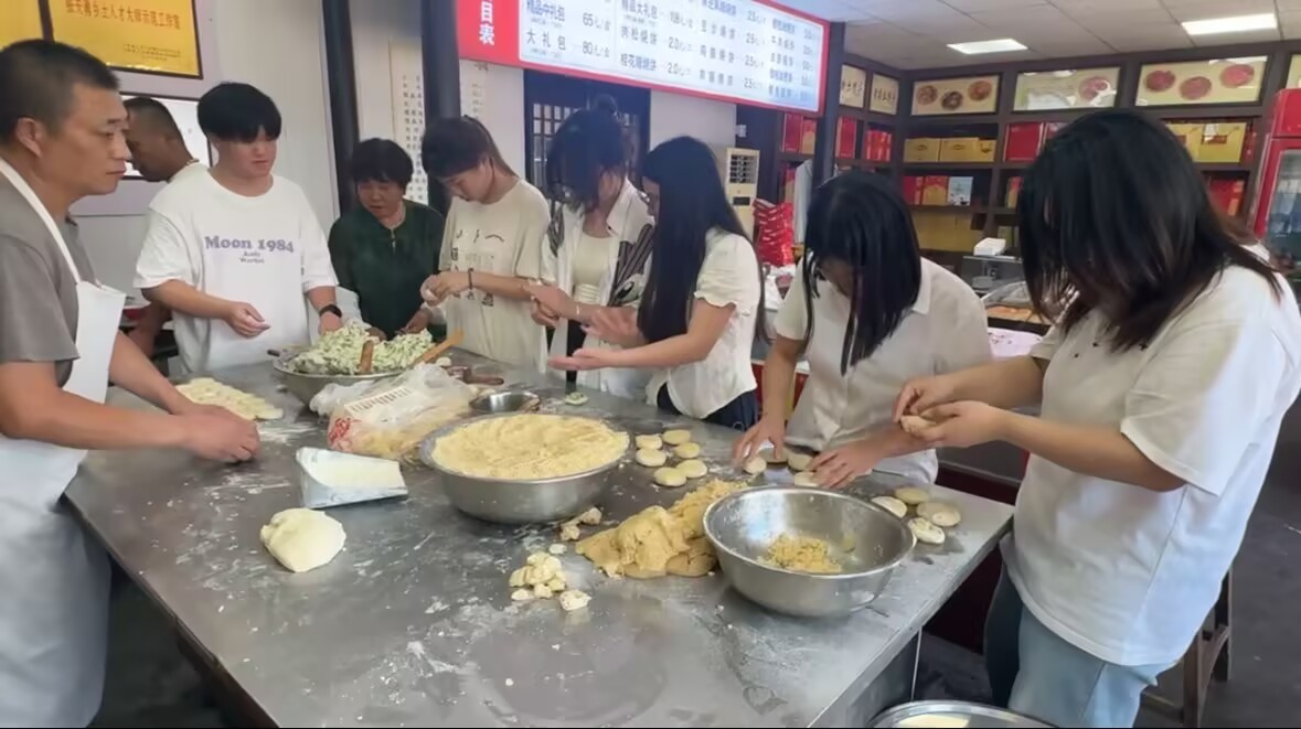 圖為團隊成員在當地學做黃橋燒餅圖 周歆妍供圖
