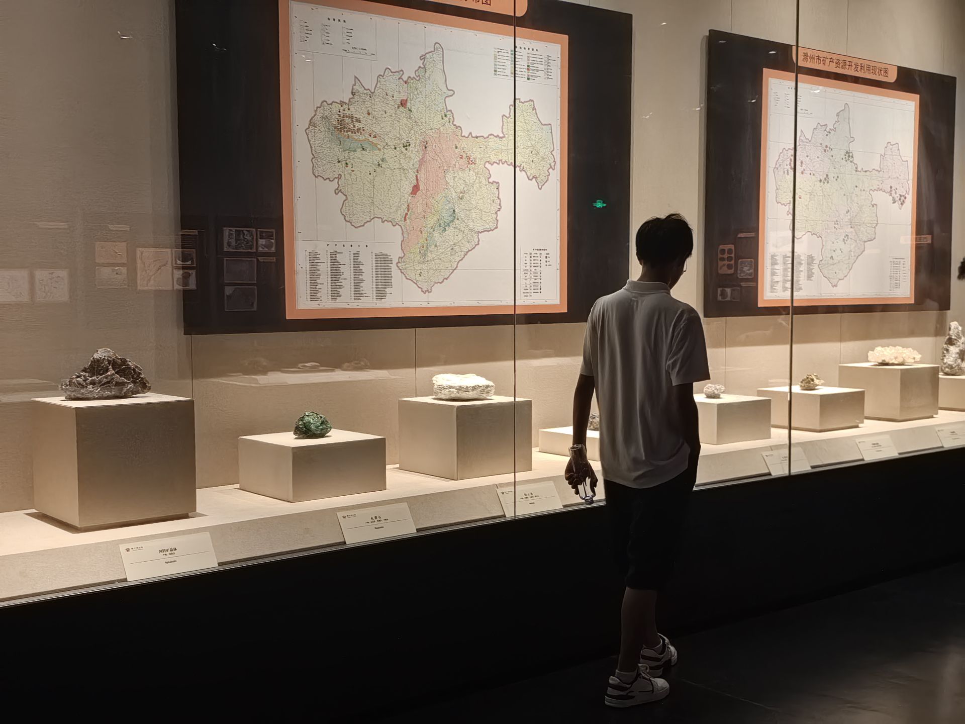 。展柜上方懸掛的《滁州市礦產(chǎn)資源分布圖》)以橙框標(biāo)注礦脈軌跡,圖例交織的色塊恰似城市工業(yè)血脈的透視沙盤,見證這座城與礦產(chǎn)共生的歷史。