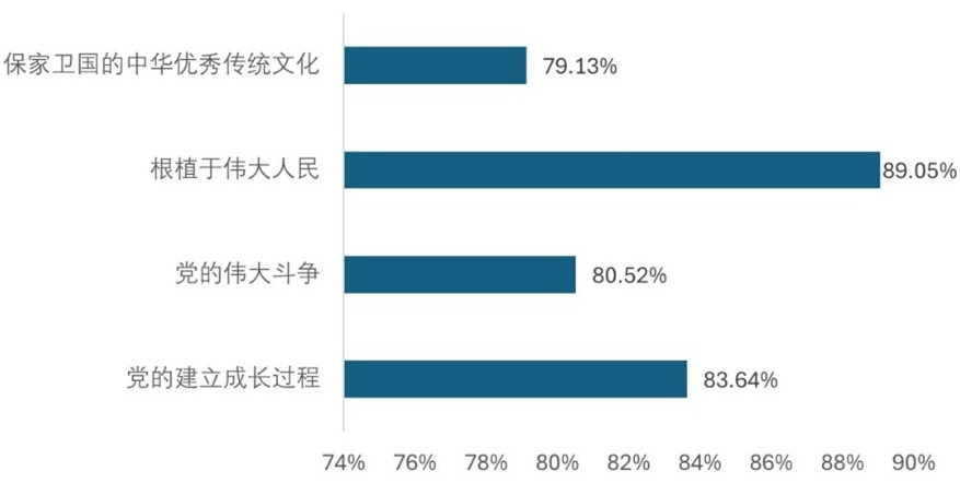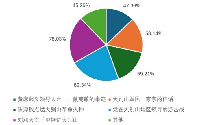 對于大別山精神的根基,多數(shù)受訪者認(rèn)為包括黨的建立成長過程(83.64%)、黨的偉大斗爭(80.52%)、根存于偉大人民(89.05%)以及保家衛(wèi)國的中華優(yōu)秀傳統(tǒng)文化(79.13%)。而在代表事件或人物方面,劉鄧大軍千里挺進(jìn)大別山(78.03%)、陳潭秋點燃黨在大別山地區(qū)領(lǐng)導(dǎo)的游擊戰(zhàn)(82.34%)等獲較多認(rèn)可。