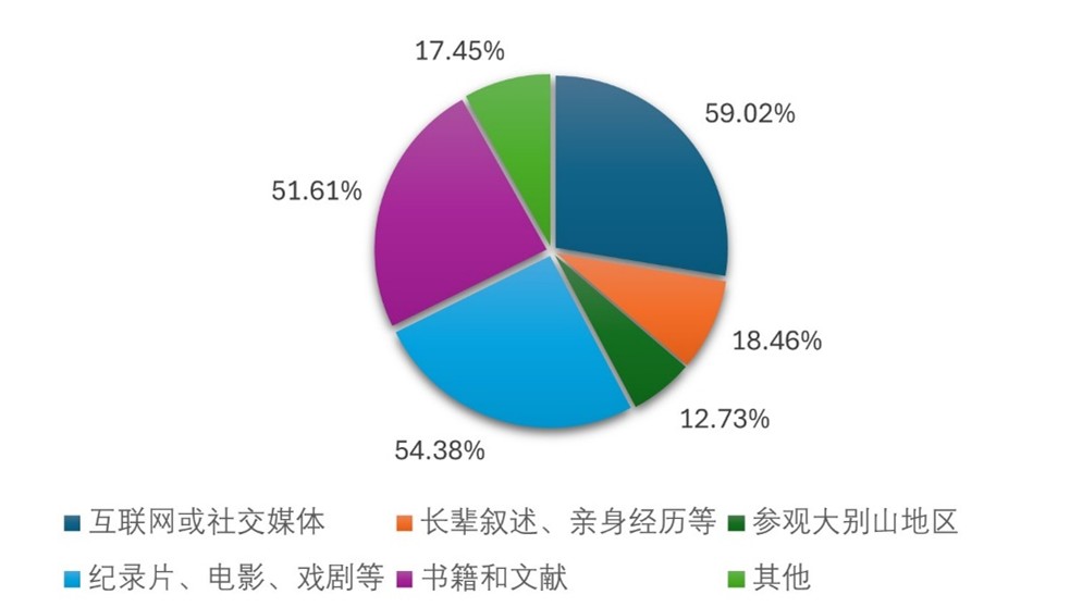 在大別山精神的認(rèn)知上,僅8.21%的受訪者表示“非常了解”,超半數(shù)(56.04%)為“了解一點”或“一般”。這說明大別山精神的普及與深入教育仍有較大提升空間。大家了解的主要途徑中,互聯(lián)網(wǎng)或社交媒體(59.02%)、影視作品(54.38%)、書籍文獻(xiàn)(51.61%)位居前三。看來,可繼續(xù)借力這些渠道,創(chuàng)新宣傳方式,吸引更多人關(guān)注和了解。