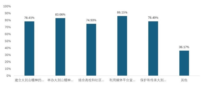 在大別山精神的弘揚方式上,多數(shù)受訪者有這些建議:86.15%支持利用媒體平臺宣傳,83.06%認(rèn)可舉辦主題文化活動,78.49%認(rèn)為要保護(hù)傳承當(dāng)?shù)匚镔|(zhì)文化遺產(chǎn),78.41%主張建立實踐平臺,74.93%提議結(jié)合高校和社區(qū)組織教育活動。多樣化的策略是推廣關(guān)鍵,通過這些方式能讓大別山精神深入人心,發(fā)揮更大社會影響力。
