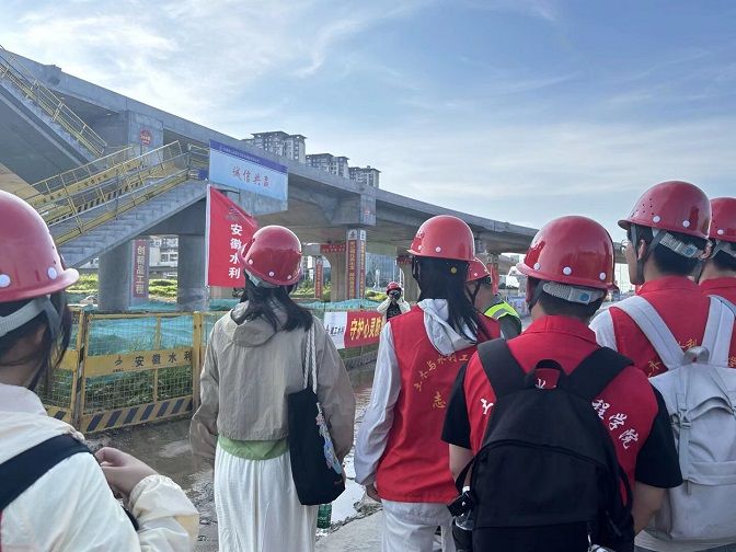 圖為團隊師生在蚌埠延安路淮河大橋施工現(xiàn)場考察調(diào)研