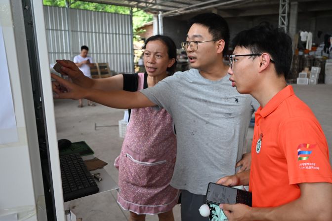 駐錦屏鎮(zhèn)果蔬專家工作站成員向團(tuán)隊(duì)介紹分揀與預(yù)冷系統(tǒng)。楊佳奇 供圖