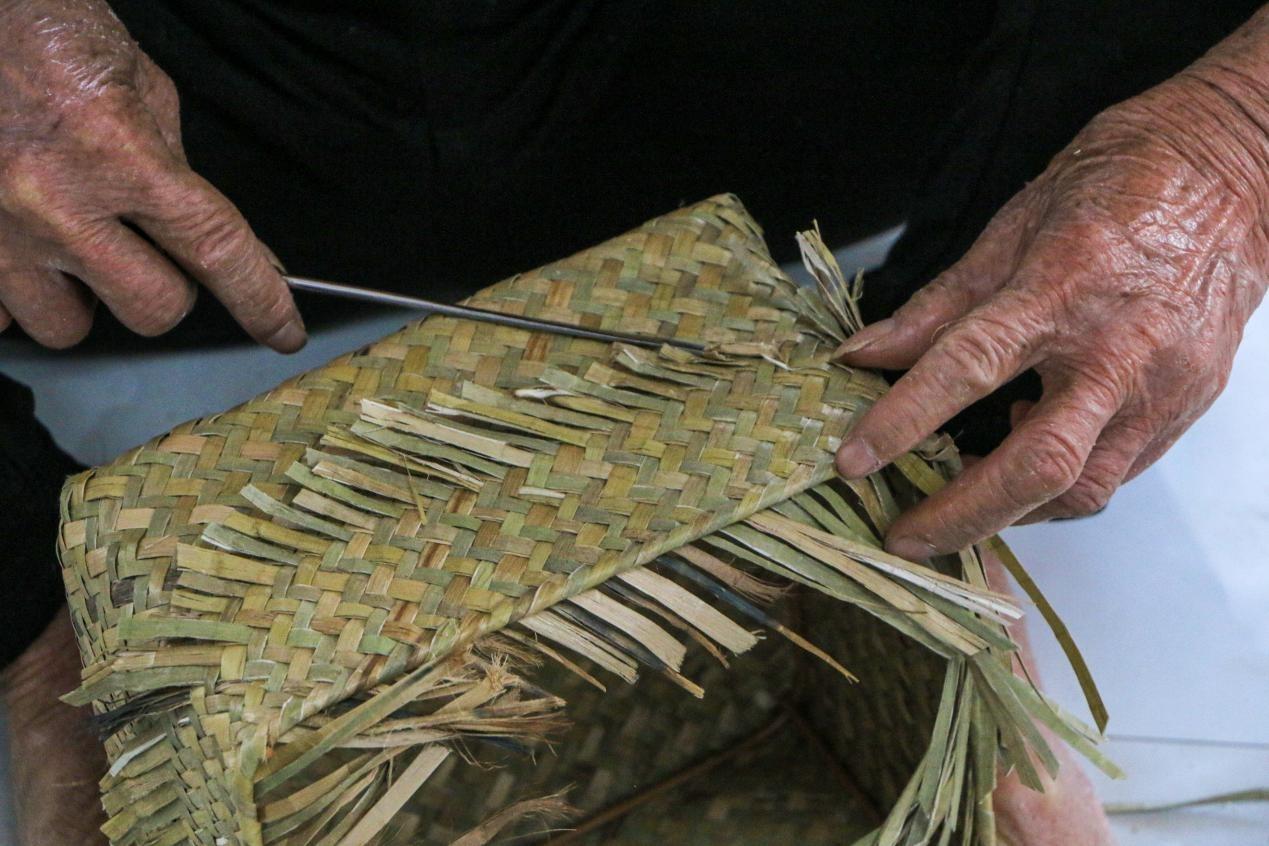 圖為編織現場 杜俊烯 攝半琢。蛻變中的詩意,部分完成編織,有了初步造型,似璞玉半琢,蘊含從自然到工藝過渡的獨特詩意。手藝人能精準把控力度,讓蒲草“壓密爬緊”,既保證紋樣平整,又讓成品結實耐用;編至換色或復雜紋樣處,他們眼神專注,手指靈活調整草的走向,千鳥紋的靈動、三角形紋的規整,在指尖漸次成型,仿佛在與祖輩流傳的技藝對話。