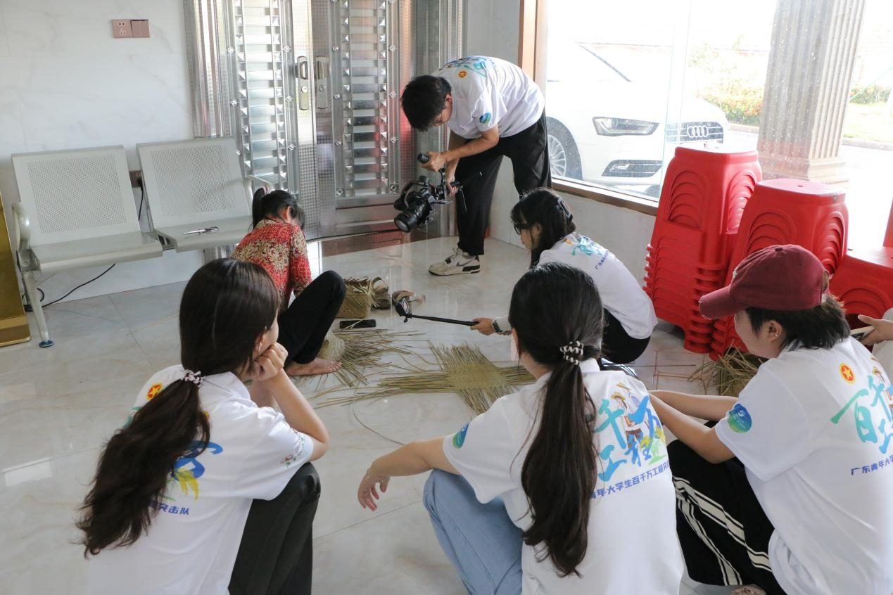 蒲草筑夢實踐團成員圍坐手藝人身旁,一邊學習蒲草編織技藝,一邊用鏡頭記錄編織全過程。成員們專注觀察、嘗試操作,將傳統草編的精巧步驟與匠人心得,融入課程素材,助力非遺技藝活態傳承。
