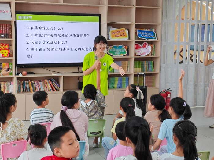 實現綠色農業需要一代代人的不懈努力。實踐團成員走進可戀莊村彩虹部落,開展果蔬農殘凈化小課堂,為小朋友們科普農殘的相關知識。課堂以“紫甘藍指示劑變色實驗”導入,通過“滴一滴、看一看、比一比”的互動環節,引導兒童直觀理解酸堿變化及農殘來源。孩子們在指導下親手操作農殘速測儀,神奇演示效果瞬間點燃了孩子們的好奇心,也讓他們對學習去除農殘方法產生了濃厚的興趣,讓環保理念和農殘意識在孩子們心中生根發芽。