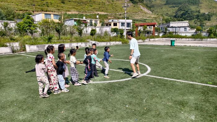課間休息時,支教隊員與孩子在操場玩跳繩、丟手絹、老鷹捉小雞,歡笑聲回蕩在山間校園;談心交流中,隊員們認真傾聽孩子的心聲,分享自己的成長故事,用鼓勵與支持幫孩子建立自信。