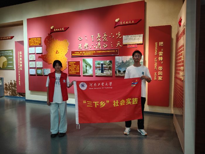 最后,兩名志愿者鄭重舉起河南工業(yè)大學(xué) “三下鄉(xiāng)” 社會(huì)實(shí)踐旗幟。紅色旗幟鮮艷奪目,“三下鄉(xiāng)” 字樣與雷鋒紀(jì)念館的紅色背景相呼應(yīng),彰顯著青春投身實(shí)踐、傳承精神的擔(dān)當(dāng)。這一畫面,定格了志愿者們參與紅色實(shí)踐的熱忱,也傳遞出將雷鋒精神融入青春奮斗的決心 。
