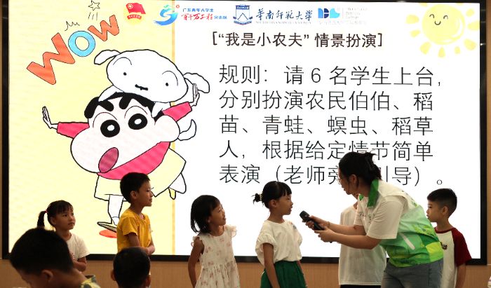 稻苗躬身抽穗,蛙兒鼓腮巡田,螟蟲躡腳偷食,稻草人挺腰守望。在"我是小農(nóng)夫"情景表演中,小朋友們分別扮演稻苗、青蛙、螟蟲和稻草人等角色,通過角色扮演了解農(nóng)田生態(tài)系統(tǒng)。