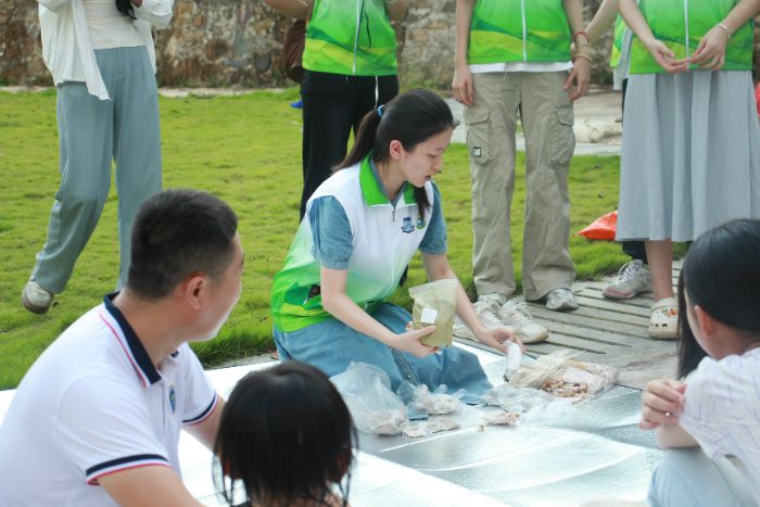 在象山藥王谷綠意盎然的長廊中,隊員將9味“仙草”的故事娓娓道來,藥草的模樣與功效在隊員們的講解下愈發(fā)清晰。隨后實踐團(tuán)設(shè)計的草藥香囊制作手工課極大調(diào)動了小朋友對草藥的興趣,孩子們在草地上埋頭制作香囊,稱粉、裝袋、拉繩,用薄荷、白芷、石菖蒲等一味味中藥粉末,把小布袋塞得鼓鼓囊囊,在實踐中體驗傳統(tǒng)中醫(yī)藥文化。一只只香氣四溢的小香囊,裝滿了小朋友的夏天。