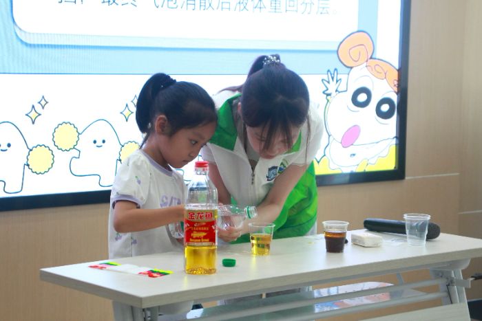小小的桌面在隊員的演示下變成了“魔法世界”。“火山”從杯中噴薄而出,小朋友們繪制的五角星,在水的折射下隱身不見,一架架“彩虹橋”在紙巾上浮現(xiàn)。驚嘆聲此起彼伏,科學(xué)的種子,也在動手實踐中悄然發(fā)芽。