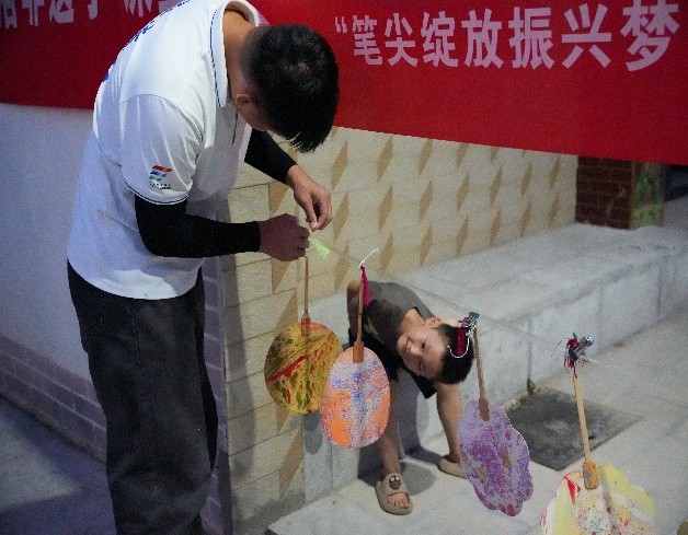 隨后,實踐團成員與兒童一起將這些漆扇作品懸掛在繩上,瞬間,漆扇隨風(fēng)飄動,形成了一道獨特而亮麗的風(fēng)景線,過往的村民紛紛駐足觀看,對這些精美的漆扇作品贊不絕口。
