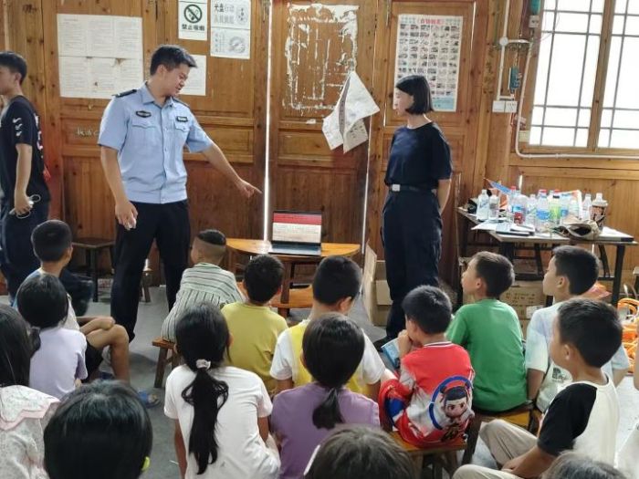“以前不知道罵人、打架可能會有這么嚴重的后果,現在我知道要管好自己的行為了。”四年級男孩小宇在課后認真地說。而當實踐團成員笑著讓從田埂跑回的美江背誦“防溺水三字經”時,美江黝黑的臉蛋泛起紅暈,扯著嗓子剛背到一半,蹲在旁邊的紅玉突然站起身:“我昨天跟媽媽去河邊,差點踩滑!要是真掉下去,就得像你們說的,立刻大聲呼救,對不對?”成員們連忙點頭,心中為孩子萌芽的法律與安全意識暗自欣慰。實踐團還為孩子們準備了圖文并茂的普法PPT,上面印著卡通警察形象和簡單的法律條文,成為孩子們隨時翻閱的“法治指南”。