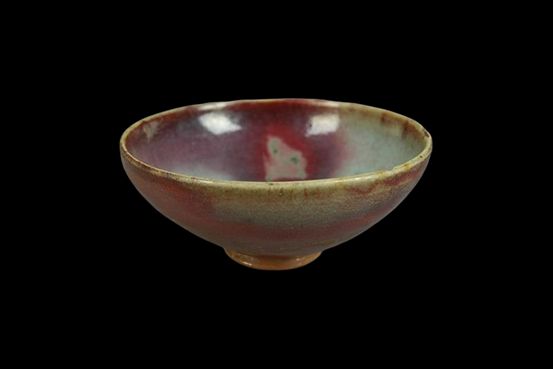 在眾多陶器中,那件宋鈞窯玫瑰紫窯變瓷碗讓我久久不愿移開目光,看似隨性卻藏著天工之妙。碗口呈規(guī)整的圓形,碗壁至碗底暈染著層層窯變釉色——深紫如濃墨凝霞,淺紫似云霞漫卷,其間還交織著細碎的天藍斑點,像把暮春的晚霞揉進了瓷胎里。宋代是鈞窯的黃金時代,作為汴京官窯體系的重要代表,鈞瓷“入窯一色,出窯萬彩”的技藝堪稱一絕,這件瓷碗雖無繁復紋飾,卻以自然窯變的奇幻色彩,詮釋了宋人對“天人合一”的追求與“絢爛至極歸于平淡”的審美境界。撫摸著展柜的玻璃,仿佛能想象出千年前汴京的官窯工坊里,工匠們凝視窯火、靜待釉色蛻變的虔誠,也能窺見文人雅士用它盛放清酒、共賞窯變奇景的雅致時光。