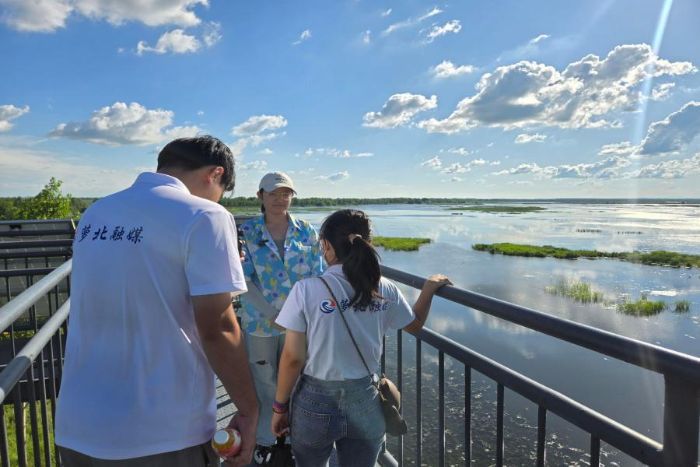 當日下午,團隊驅車前往嘟嚕河濕地自然保護區。這里水網縱橫、島嶼密布,獨特生態環境成為珍稀水鳥的重要棲息地,也為觀測提供了絕佳條件。抵達后,保護區工作人員著重提醒:“濕地生態脆弱,野生動物對環境敏感,人為干擾可能影響其覓食、繁殖,破壞生態平衡,觀測時務必保持安全距離,避免驚擾。”隊員們牢記要求,嚴格遵守規定,在指定區域通過望遠鏡觀測到多種水鳥,并細致記錄其活動情況。