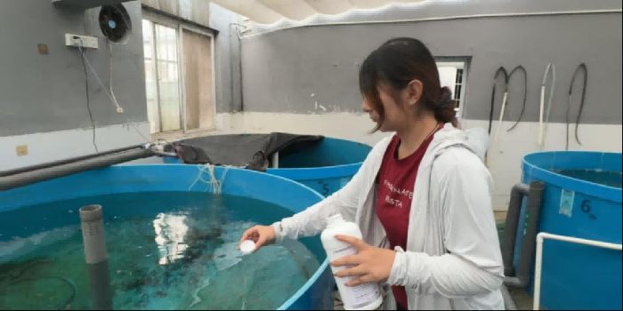 圖為小組成員對(duì)養(yǎng)池內(nèi)的南美白對(duì)蝦進(jìn)行采樣。王衍睿涵 供圖